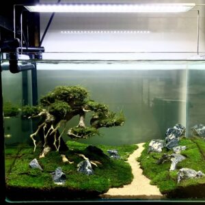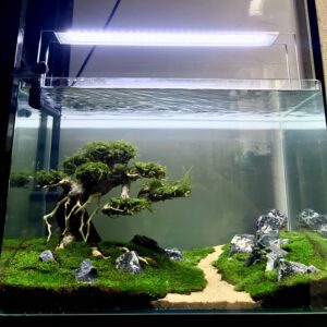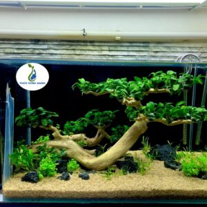 - Thực vật: phân nền GEX xanh, đá tai mèo, cát trắng, cây Bonsai, rêu Minifiss, rêu Java và một số loại cây thuỷ sinh khác như Huyết tâm lan, rong đuôi chồn, lan nước….